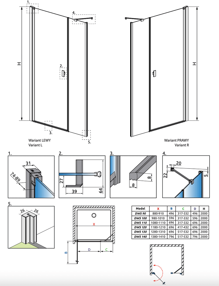 • Standardhøjde: 2000mm til overkant af glas