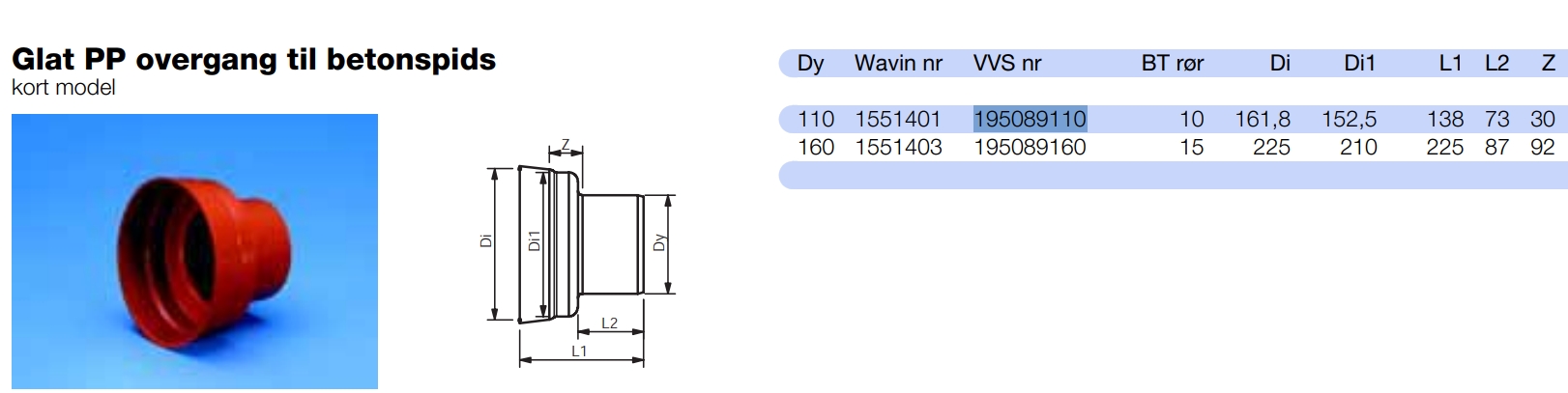 Glat PP overgang til betonspids, kort model. Eksklusiv gummiring